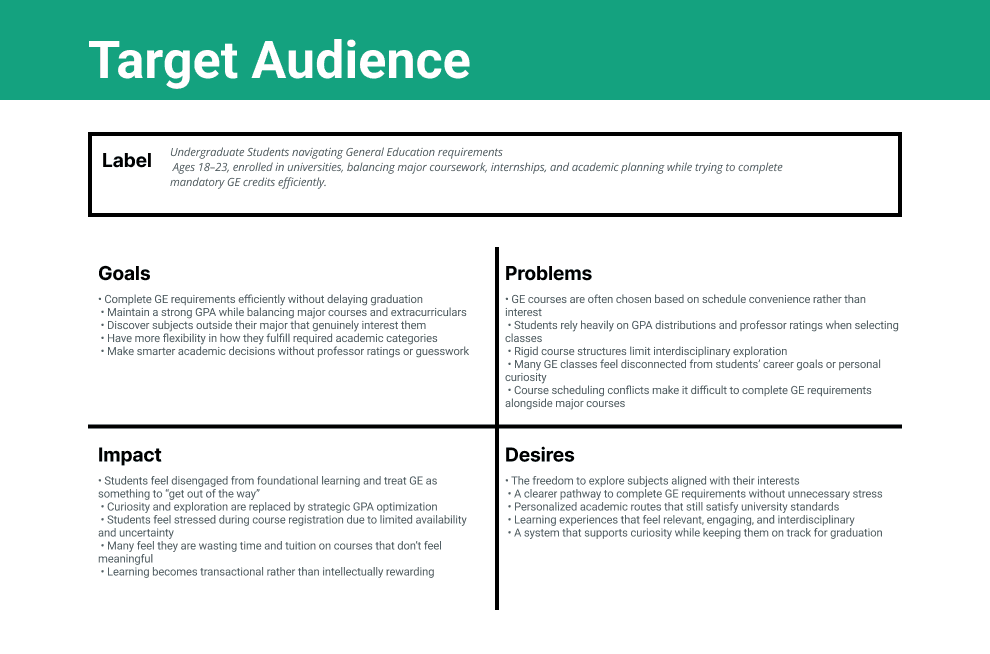 We analyzed the current General Education ecosystem through stakeholder mapping, personas, and systemic research into student and faculty experiences.